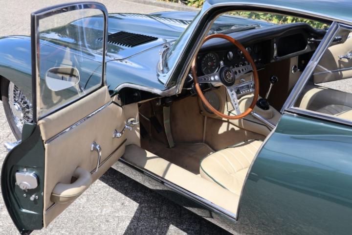 What makes this E-Type especially desirable is its original colour combination: Opalescent Dark Green with beige leather interior, elegantly finished with green piping. A rare and highly attractive specification, just as it left the factory in 1966. The paintwork still presents with a deep shine, and the interior exudes unmistakable British class.