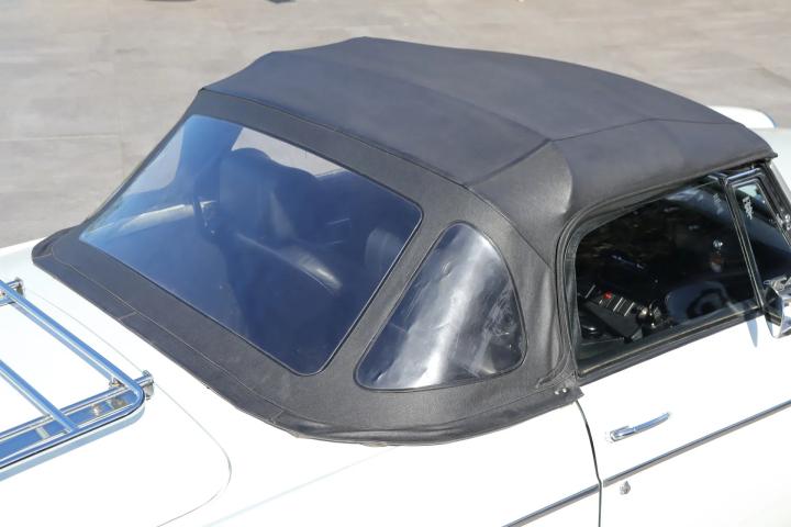 De carrosserie is zeer netjes en roest- en schadevrije. Het lakwerk springt in het oog en is opvallend fris. Ook de rubbers en de verlichting zijn gaaf. De spaakwielen beschikken over goede banden en aan de voorzijde geven rood gespoten remblokken de auto een sportieve touch. Leuke accessoires zijn het kofferrekje en de trekhaak. De originele chroombumpers zijn vrij van noemenswaardige beschadigingen. Ook de softtop verkeert in goede staat zonder scheuren of beschadigingen, en het sluitwerk functioneert goed.