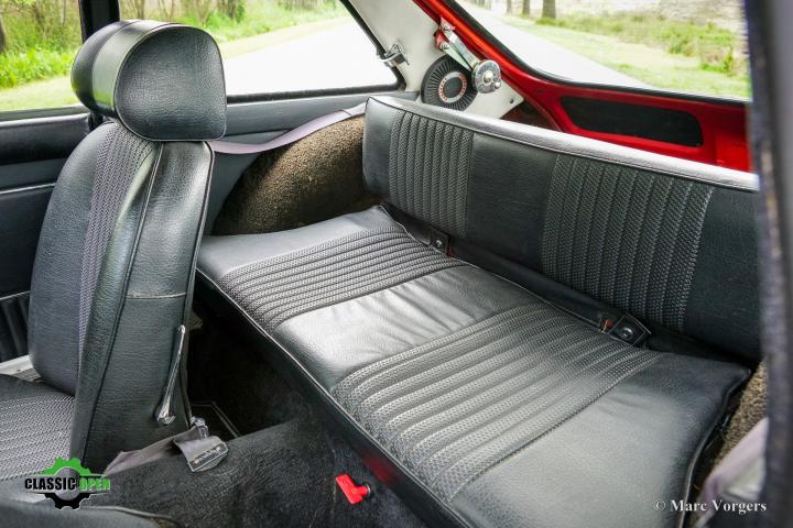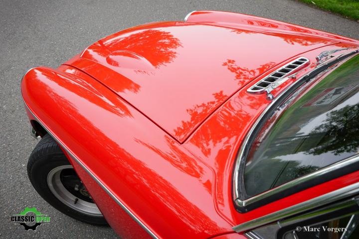 Chassisnummer GHD5 2462796. Rode exterieurkleur gecombineerd met een zwart vinyl interieur en zwart tapijt.