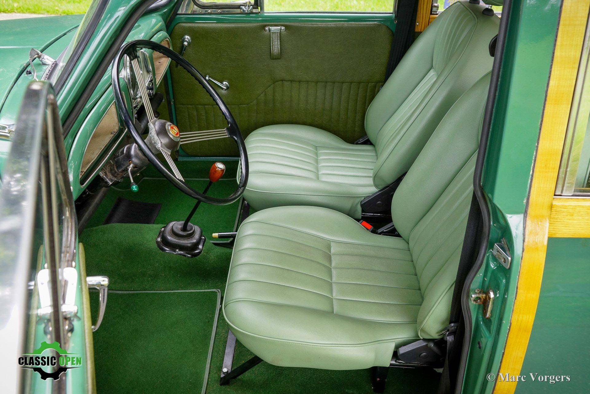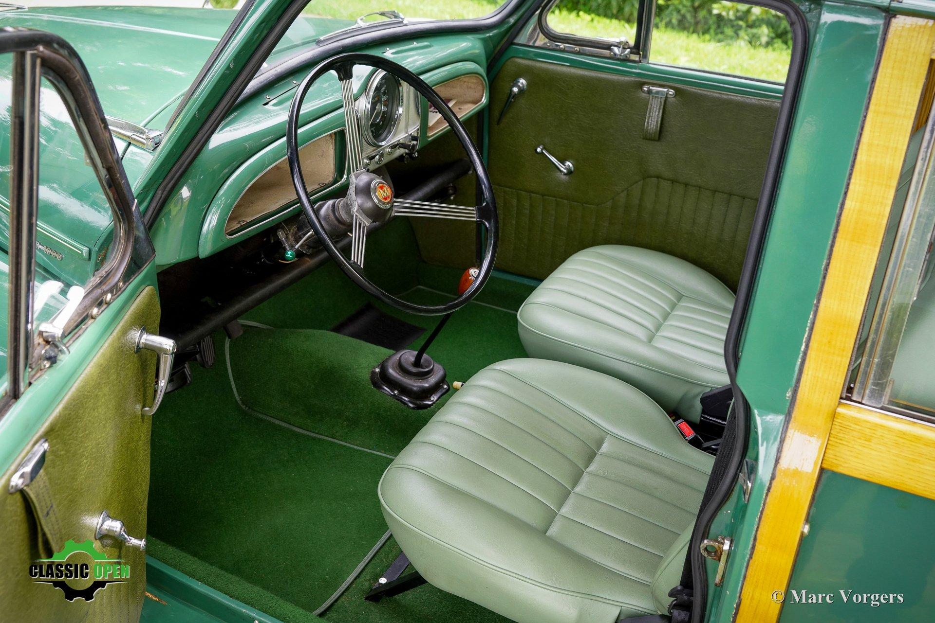 Deze prachtige Morris Minor Traveller uitgevoerd in Almond Green met een bijpassend groen interieur, werd in 2001 geïmporteerd uit Engeland en is sindsdien zorgvuldig onderhouden in Nederland.