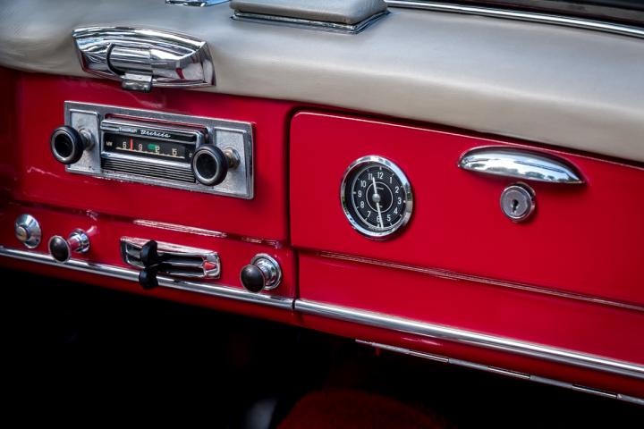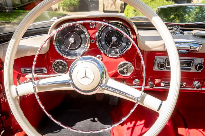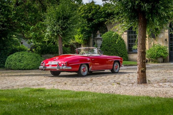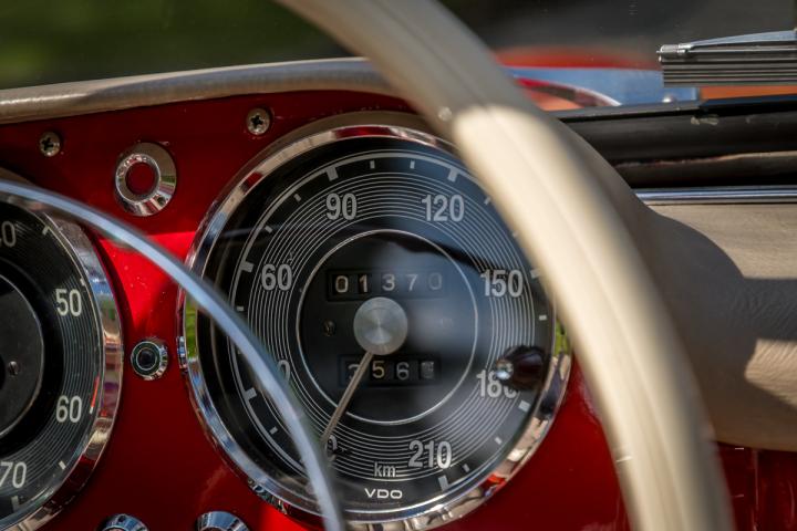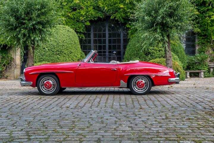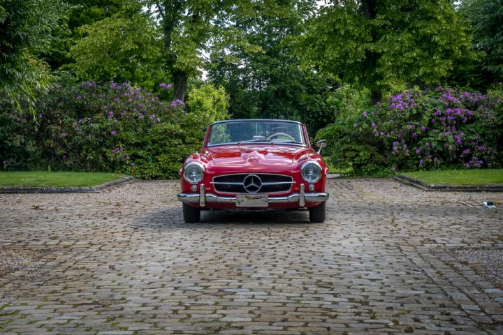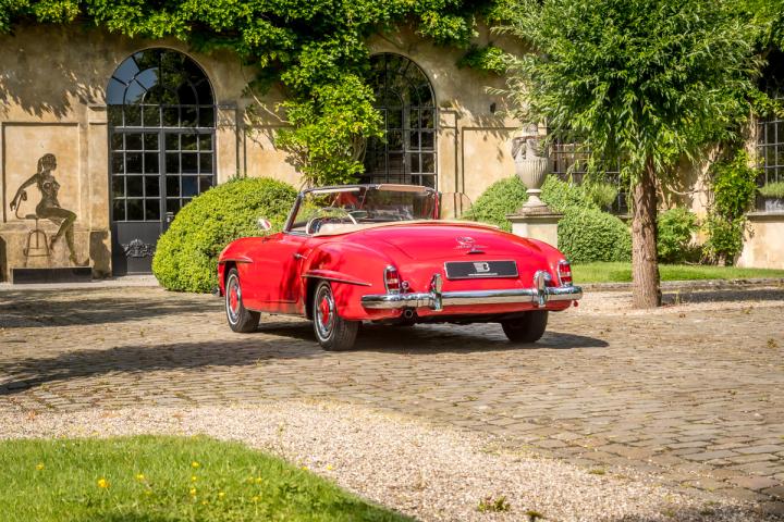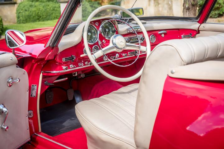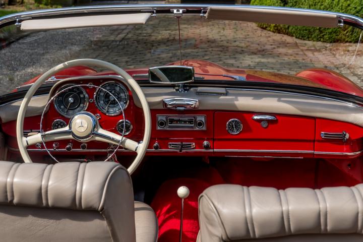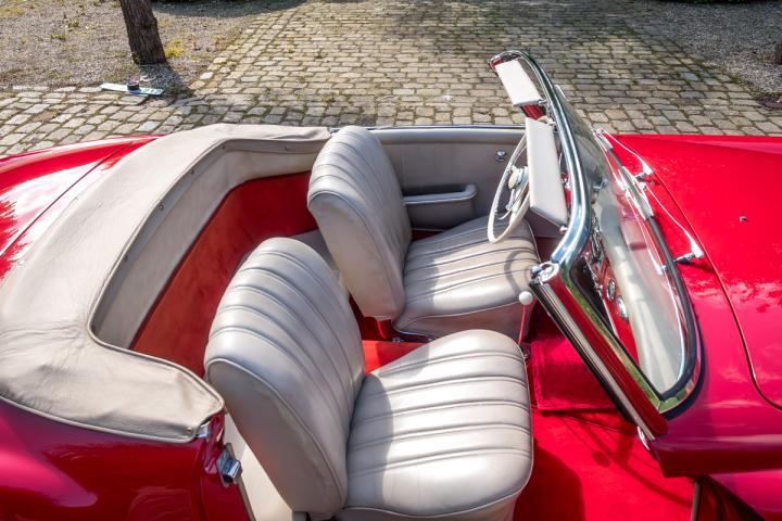 The color blend is as sporty as timeless. The interior trim has been renewed more than 30 years ago which offers the car that nice patina we all prefer to the brand new look. The car was new delivered in the actual same red. The car has been repainted. The MB 190SL is a fixed value in the classic car market and retains its value, making from this classic car model a safe purchase combining stable investment and driving pleasure.