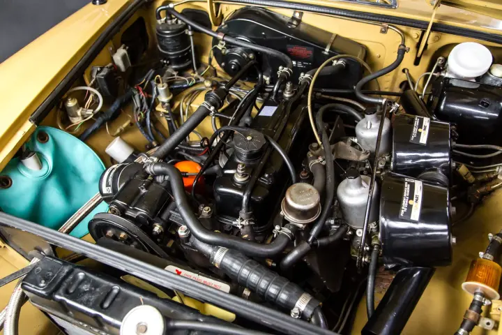 This car is tight in the suspension, with a quiet transmission, and smooth overdrive. Brakes are in good order ,the tires are deep in tread. The instrumentation gauges are clean ,crisp ,and work as designed .All electrical are in good working order .Chrome and bright work is in excellent condition .Seats sit full and in good condition, carpets are good, door cards are straight, soft top is in good condition.