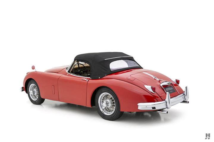Cosmetically, the car presents very well, finished in a striking yet tasteful color combination that suits the graceful lines of the XK150. The Carmen Red paintwork complements the flowing bodywork, while the Biscuit leather interior provides a warm and inviting contrast. The overall presentation reflects careful stewardship and thoughtful maintenance, offering a level of finish that can be shown with pride at regional and mid-tier concours events while remaining approachable enough for regular enjoyment.