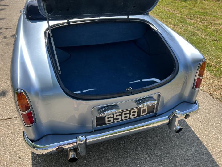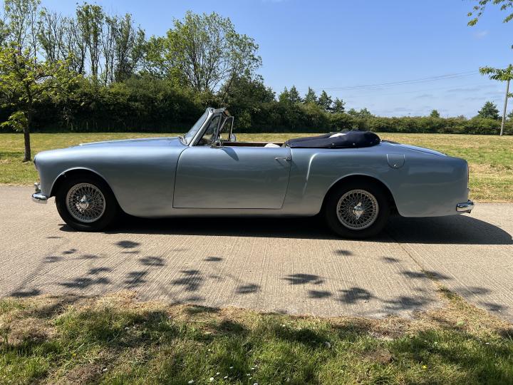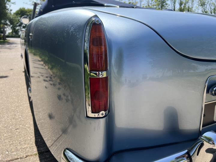 During the restoration both Engine and gearbox were rebuilt, carbs rebuilt tuned and balanced. The body was restored, repainted in its original colour of Alice Blue, new carpets fitted throughout, a new mohair hood complete with west of England cloth headlining was installed and catches re-chromed. The brakes were overhauled by Red Triangle Garage with new Coopercraft four pot front callipers and discs.