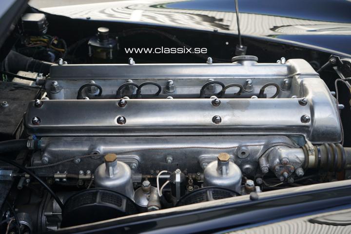 Interior: The Jaguar XK120 FHC is designed for averaged-sized drivers. In this car, the seat bottom is slightly lower on the driver’s side to accommodate a taller driver. The leather seats and carpets are in excellent condition, and the wood panels are nice despite a few small cracks in the clear coat. The door cards and headliner have also been recently replaced. Right behind the seats, there is a small compartment, and underneath it, there are two brand new batteries.