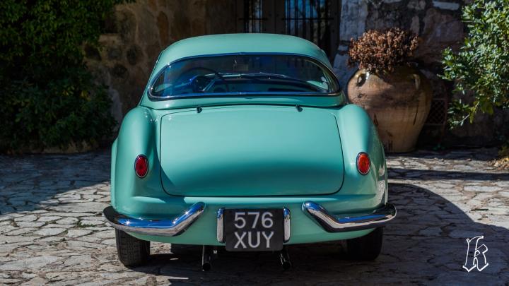 “Full de Dion suspension incorporates brakes, transmission and rear gearbox. Brakes are oversize, inboard and finned; steering is precise and direct. Aluminum body by Farina provides superb driving position and fine finish.