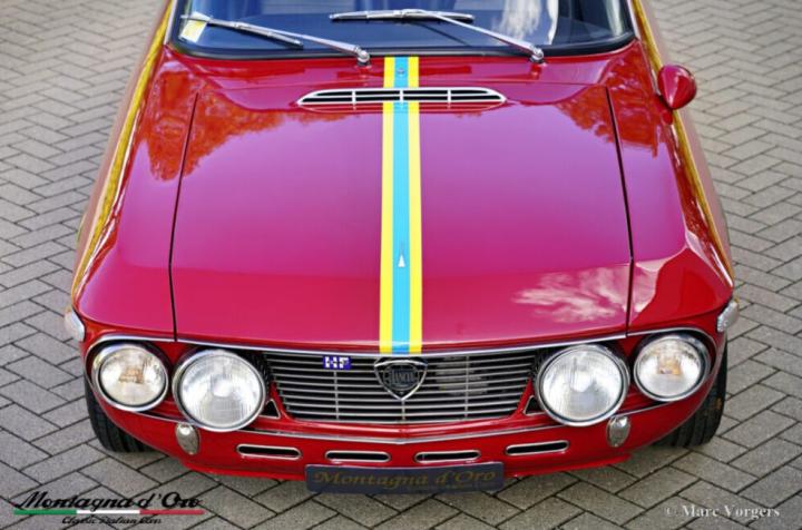 Kleur donkerrood met gele en blauwe strepen waar er 100 van gemaakt zijn dit is dus de “laatste” van die 100 (geel/ blauw van de stad Turijn) gecombineerd met een zwartlederen interieur en zwart tapijt. Deze Lancia Fulvia Coupé 1600 HF is de heilige graal van het Fulvia programma.