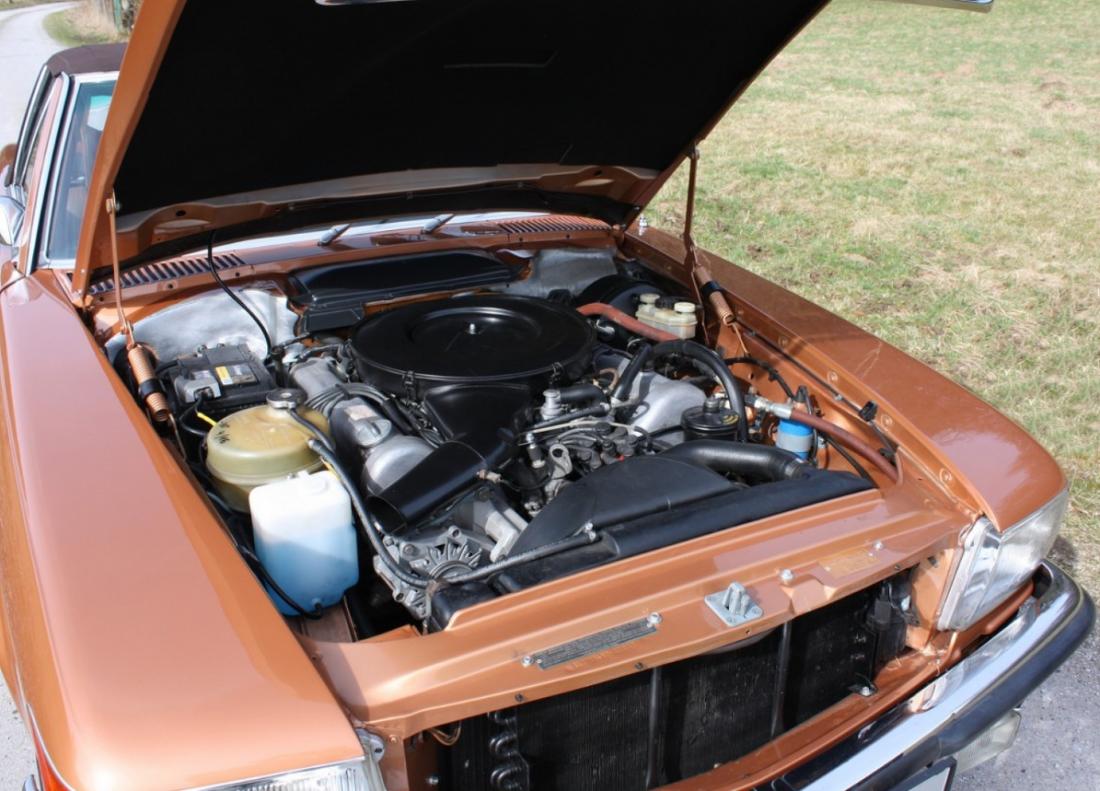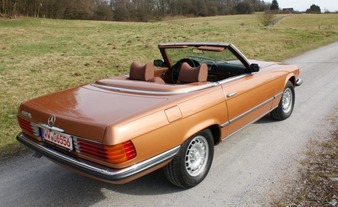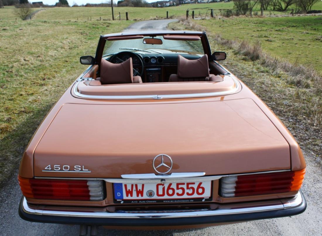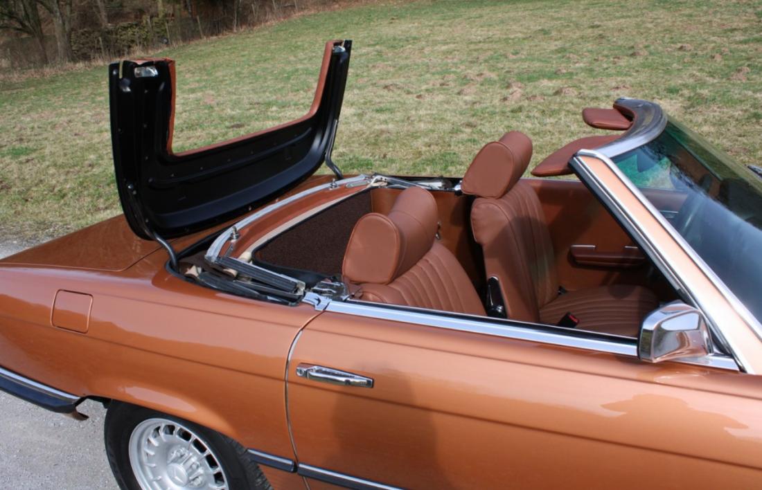 der 450SL wurde erst im Frühjahr 1973 vorgestellt und galt bis dato als stärkste Motorisierung der Baureihe W107. Der hier angeboetene 450SL wurde restauriert auf nahezu Rostfreier Basis, das Fahrzeug kam aus Kalifornien, aus Zweitbesitz gefahren von einber älteren Dame bis 2005, danach stillgelegt. Original nur 90000 Meilen in einer schönen und seltenen Farbkombination "Byzanzgold Metallic Farbcode 422" war nur 3 Jahre im MB Programm zufinden von 1971-73. Bei der Restauration wurden sämtliche Fahrwerk Gummis und Lager gewechselt, die Vorderachse wurde ausgebaut gestrahlt und Schwarz beschichtet, das Differenzial wurde abgedichtet, Lenkungsgelenke erneuert, alle relvanten Verschleißteile von Fahrwerk und Motor wurden getauscht, Kerzen, Kontakte, Öle, Filter etc. Die Frontscheinwerfer sind Neue BOSCH Scheinwerfer, die Stoßstangen waren damals noch weltweit einheitlich und sind original, der Tank wurde gereinigt und versiegelt. Das Interieur wurde größtenteils restauriert, bis auf das Amaturenbrett, die Sitze wurden Neu aufgepolstert mit neuen Unterpolster und Neu beledert, selbes wurde auch mit den Türtafel durchgeführt. Der Teppichbodensatz wurde komplett erneuert, neues KHM Sonnenland Verdeck in Dunkelbraun, sämtliche Verdeck, Tür und Kofferaumdichtungen sind Neu, mit externen unrestaurierten Hardtop. Die Barock Felgen sind gestrahlt und beschichtet mit neuer Bereifung. Mit aktuellem TÜV, Oldtimerzulassung und deutschen Brief, Classic Data Gutachten Note 2+. Das Fahrzeug befindet sich in einem hervorragenden Zustand und ist alltagstauglich.