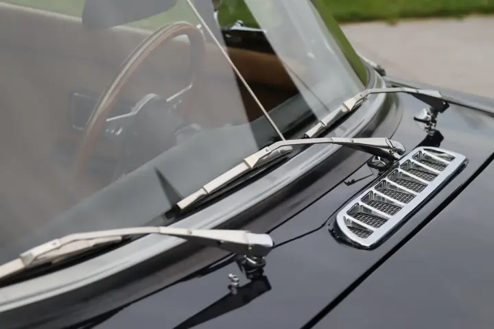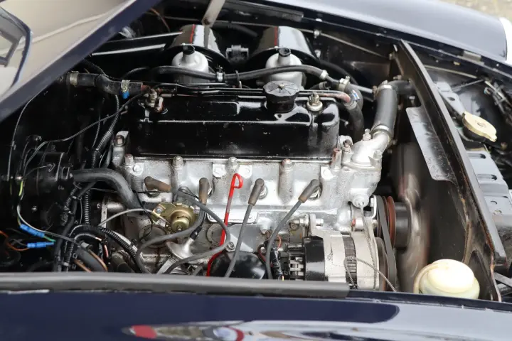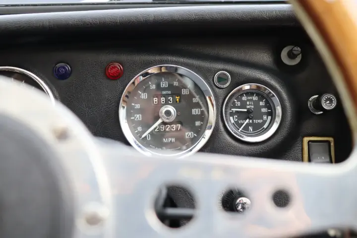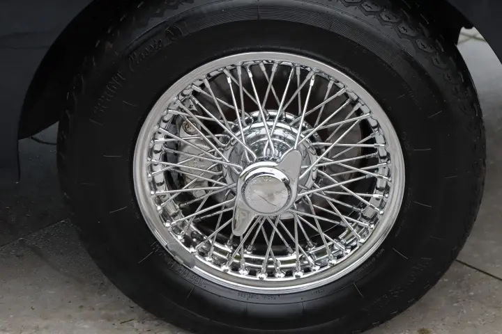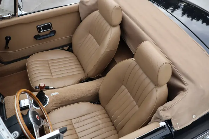 The car has been restored in the past, with the paintwork being sprayed neatly. The bodywork is very neat and free of rust and damage. The paintwork is eye-catching and strikingly fresh. In November 2025, the car was professionally polished, making it shine like never before. The “Union Jack” emblems adorn the side. The rubbers and lighting are also in good condition. The wire wheels have good tyres. The original chrome bumpers are free of significant damage. The chrome work is in very good condition. The windows are tinted. The soft top is also in good condition with no tears or damage, and the fastenings work well.
