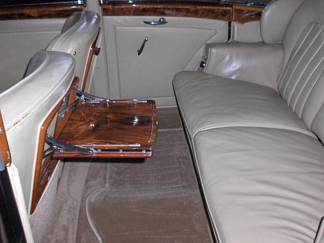 Silver Wraith #WOF64 is sometimes called a H.J. Mulliner saloon, sometimes a Touring Limousine. It is a very comfortable car with a lot of space, suitable for four (and even five) passengers, built on the short wheelbase with body number 5323 to design 7249 of H.J. Mulliner. It is provided with the 4566 cc six-cylinder-in-line “big bore” engine, which gives the car a good amount of power. Some striking features are the very elegant rear wheel covers, the picnic tables and the Kneeling lady.