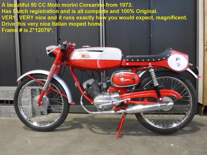 Een prachtige 50 CC Moto Morini Corsarino uit 1960. Heeft Nederlandse registratie sinds 1973. Geheel compleet en 100% origineel. ZEER, ZEER fraai en hij rijdt zoals hij eruit ziet. En deze prachtige Italiaanse brommer staat hier voor u rijklaar. Grootste keus in ECHTE klassiekers met meer dan 450 stuks in "de Stolze Collectie", van project tot perfect !