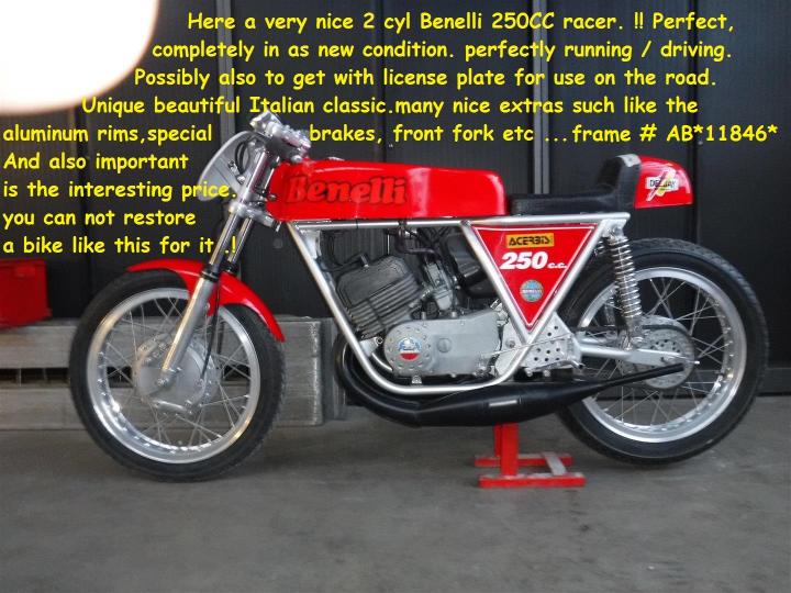 Dit is wel weer een héél mooie 2 cil Benelli 250CC !! Perfect, geheel in nieuwstaat en perfect lopend rijdend. Eventueel ook met kenteken voor op de weg te krijgen. Uniek mooie Italiaanse klassieker.Veel mooie extras zoals de aluminium velgen,speciale remmen, voorvork enz ... En ook belangrijk is de interessante prijs. Daar kan je zon motor niet voor restaureren ! Grootste keus in ECHTE klassiekers met meer dan 450 stuks in "de Stolze Collectie", van project tot perfect !