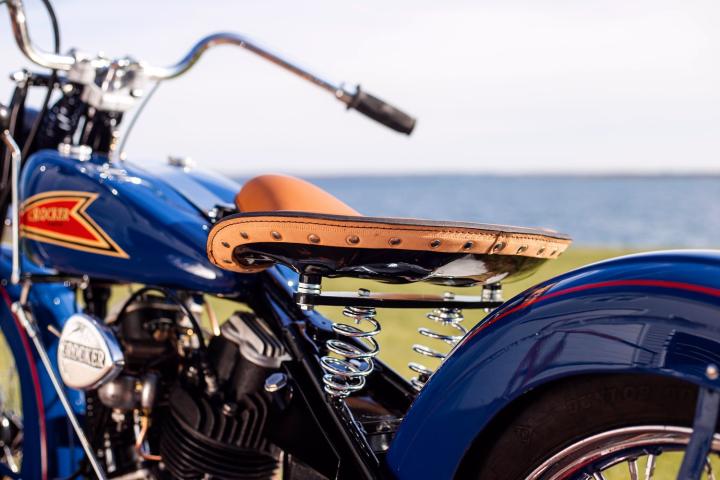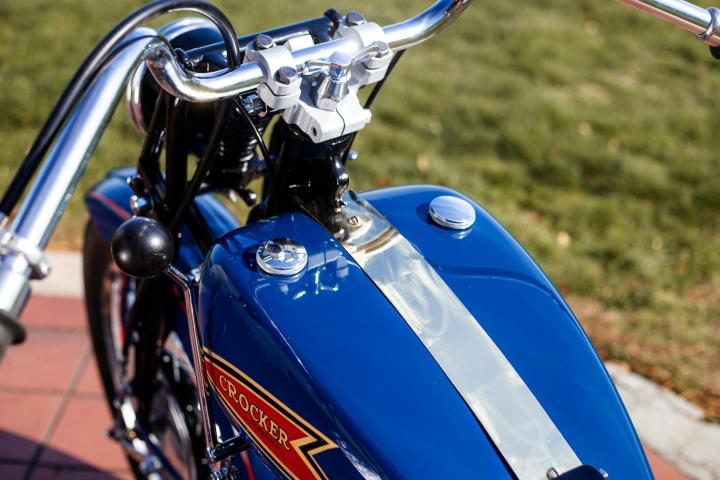 It’s estimated that Crocker made only thirty-one of the Speedways before turning his attention to a new project - developing a large displacement V-twin roadworthy bike to compete against Harley-Davidson and Indian. From 1934-1935, with the help of Paul Bigsby, Crocker achieved his goal and completed a new overhead-valve 1,000cc V-twin with hemispherical combustion chambers and 50HP, making it one of the most power motorcycles in the world at the time. Crocker's first OHV V-twin roadster came out in 1935 and Harley-Davidson wouldn’t introduce their slower and heavier first OHV V-twin (the EL ‘Knucklehead’) until six months later. “To give his Crockers an extended range, the size of the cast-aluminum fuel tanks were enlarged in 1938, making all earlier models ‘Small Tanks’, and later models ‘Big Tanks’.” (Vintagent)