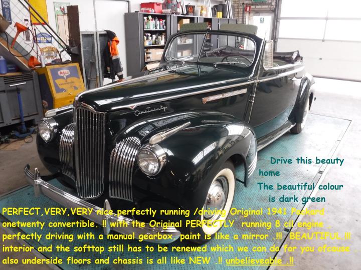 Prachtige, ZEER, ZEER mooie, perfect lopende rijdende originele 1941 Packard onetwenty cabriolet. Met de originele PERFECT lopende 8 cil motor,goed rijdend met een handgeschakelde versnellingsbak. Was 72 jaar in dezelfde familie, dus heel veel historie bij deze auto.De lak is als een spiegel. Ook de onderkant, de vloeren en het chassis zijn als nieuw ! Het interieur en de softtop moeten nog vernieuwd worden wat wij uiteraard voor u kunnen doen. Grote keus in ECHTE klassiekers in "de Stolze Collectie", van project tot perfect !