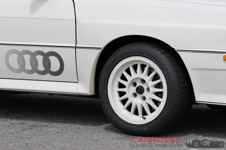 Our 1984 Audi Quattro is finished in a beautiful 'Alpine White'. This paint makes a nice combination together with the checkered brown fabric upholstery and the 15-inch white wheels. Both the paint and the upholstery are in very clean and original condition. It has a grey skai leather headlining.