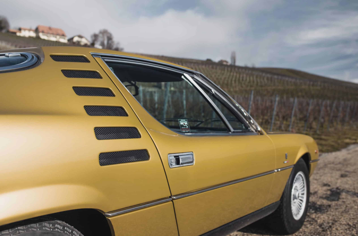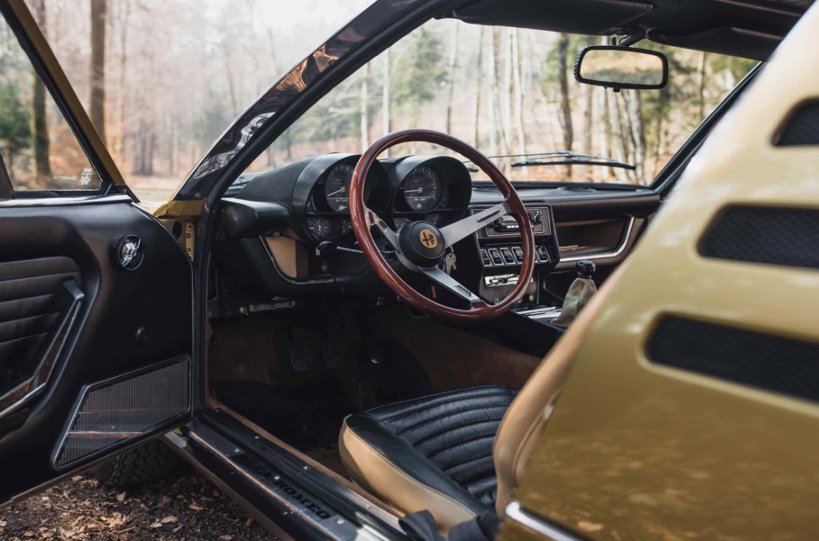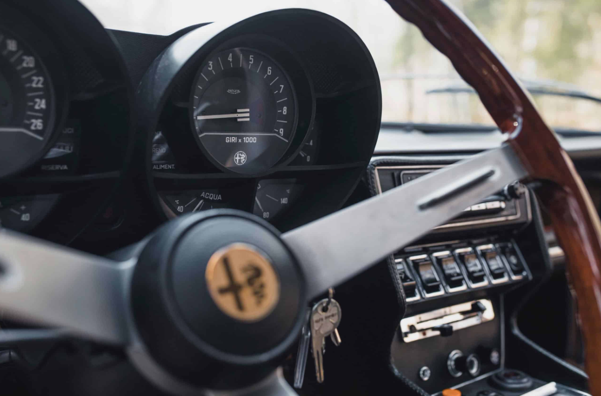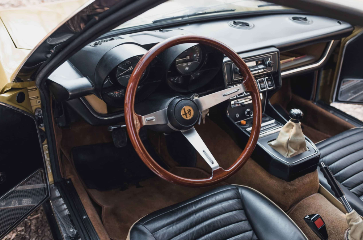 The Alfa Romeo Montreal’s design is an artful blend of Italian flair and avant-garde aesthetics. Penned by the renowned Marcello Gandini at Bertone, the Montreal boasts distinctive features that set it apart from its contemporaries. Its most striking feature is undoubtedly the iconic slatted “coda tronca” (chopped tail) rear window, which not only serves as a design statement but also aids rearward visibility. The retractable headlamps and sculpted front grille add to its distinctive character.