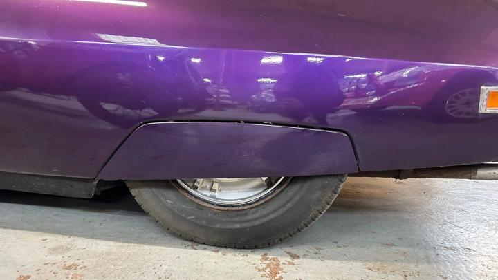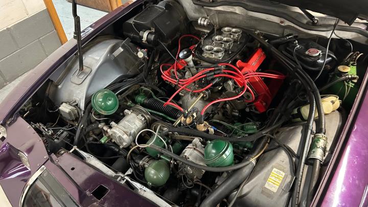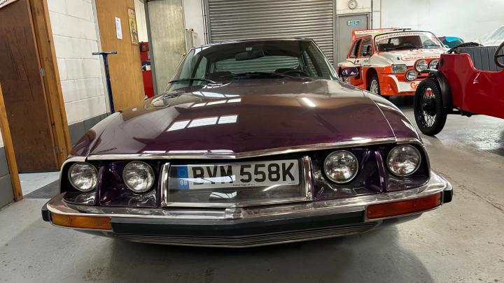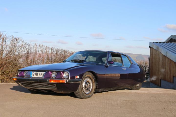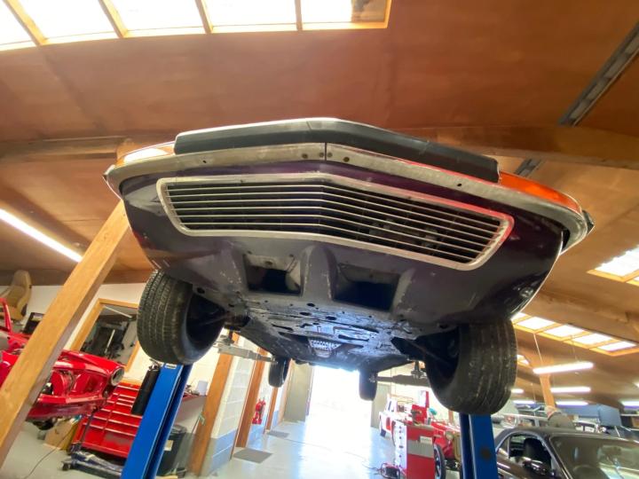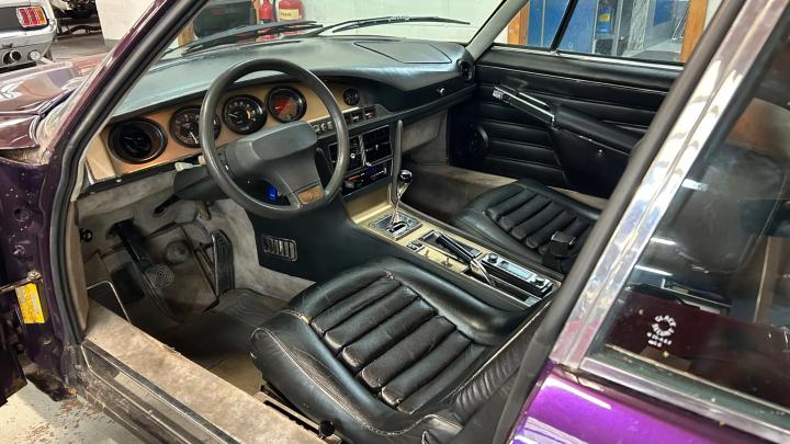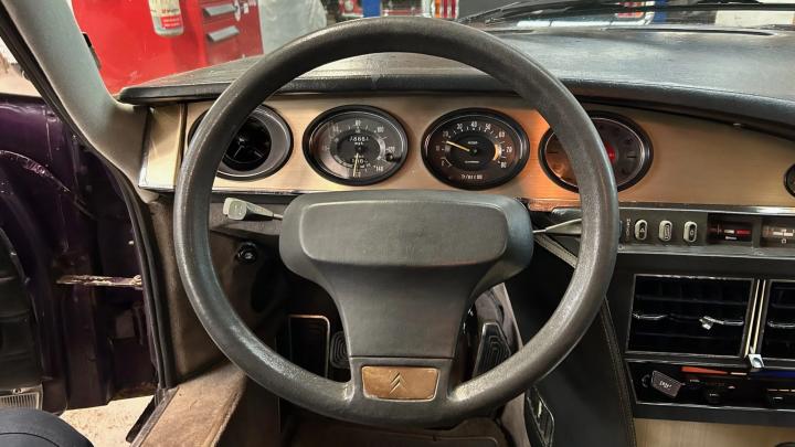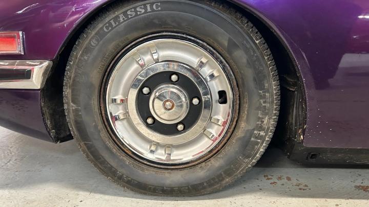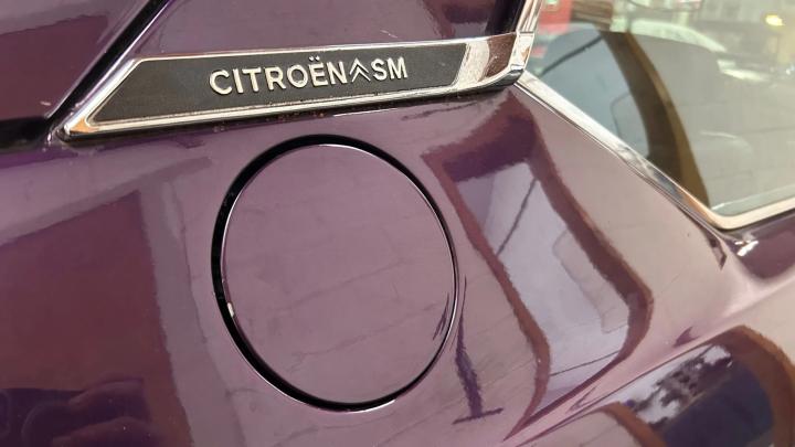 The Citroen SM boasts a striking purple exterior that captivates the eye, despite some minor paint imperfections and light corrosion in specific areas of the body. All doors function smoothly without any noticeable drooping, showcasing the vehicle’s structural integrity. Equipped with fixed four sealed beam headlamps in the American style, the SM’s design, overseen by Citroen’s chief designer Robert Opron, exhibits a familial resemblance to the CX, GS, and the Maserati Mistral.