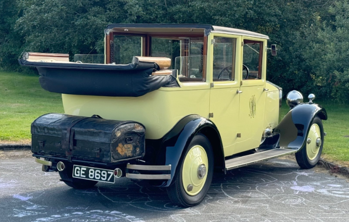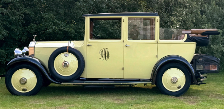 A delightful, early 20/25 with traditional, tall, upright coachwork, very stately, but fresh and cheerful in very nicely carried out primrose paintwork with tan leather interior, attractive veneers, and excellent headlining and carpets. In fact, the car is very fresh and clean throughout, inside and out. The car has some appealing vintage features, such as two-way divided windscreen, a 'porthole' communication window to the division, a lovely set of instruments, P80 'bullseye' headlights, 'Windover patent' slimline bumper front and twin bladed quarter bumpers at the rear, a full set of wheel discs (also Windover's own) and a very 'characterful' trunk on the rear. We have just completed an engine overhaul, which included new main and big end bearings, new pistons and little ends, timing case bearings, etc, and a clutch overhaul while we were at it, giving the car new lease of life. Correct, attractive and smart, offered newly MoT tested. The last owner very effectively turned the car into a 'Darling Buds of May lookalike', and we have included a Lledo model of it to complement this, as you will see in the photos.