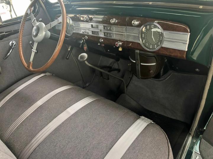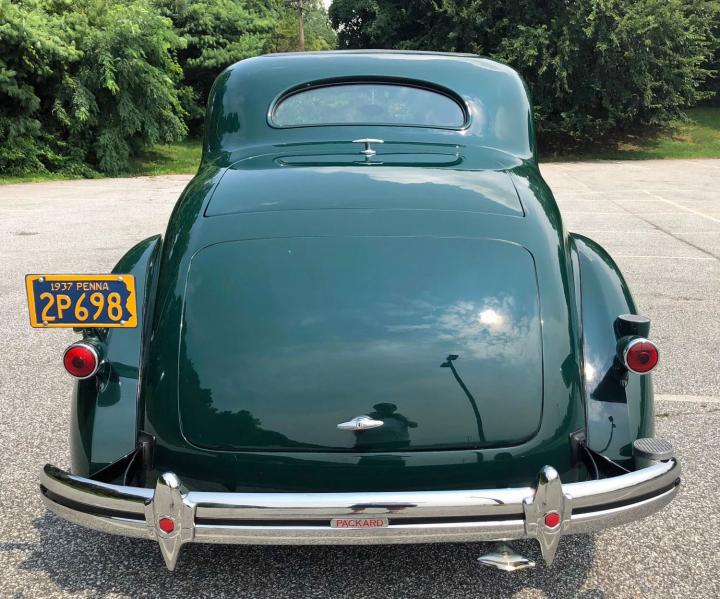 1937 Packard Sport Coupe, with rumble seat, beautifully restored, completely rust free, gorgeous Coachman Green paint, immaculate Gray broadcloth interior with amazing wood-graining, Gray leather rumble seat, brilliant chrome and trim, smooth and powerful 282 cu in 120 HP Straight 8 engine, 3-speed transmission, porcelain manifolds, deluxe heater, new radial tires, fully serviced and ready to drive, rare and stunning!