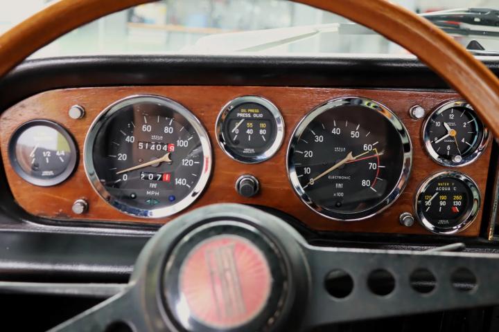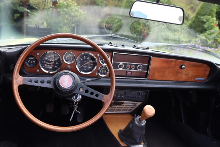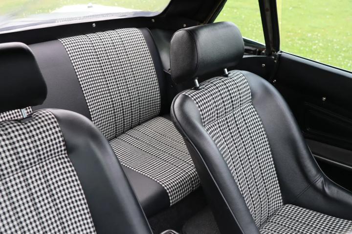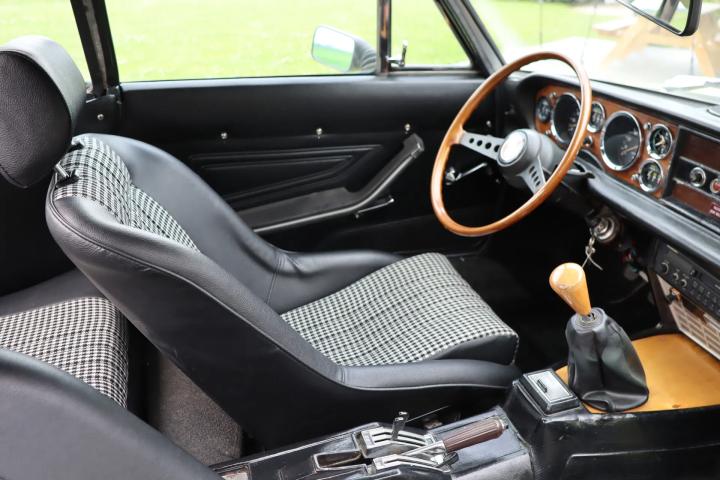 Het interieur is vernieuwd en verkeert daardoor in een nette staat. De kuipstoelen en achterbank zijn uitgevoerd in half leder en half stoffen bekleding. Een mooie optie is het 2-spaaks houten stuurwiel. Op het houten dashboard is er een uitgebreid instrumentenpaneel te vinden met diverse meters zoals oliedruk, temperatuurmeter, voltmeter en een toerenteller. Ook beschikt het interieur over verwarming en een radio-cassettespeler.