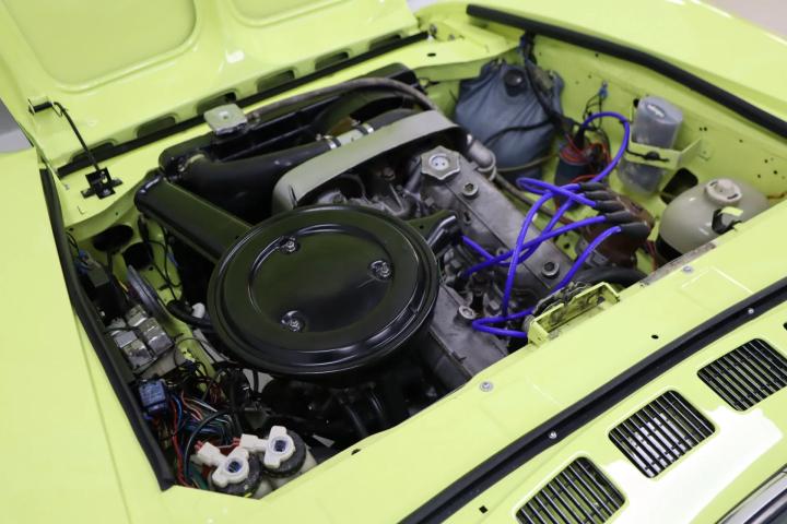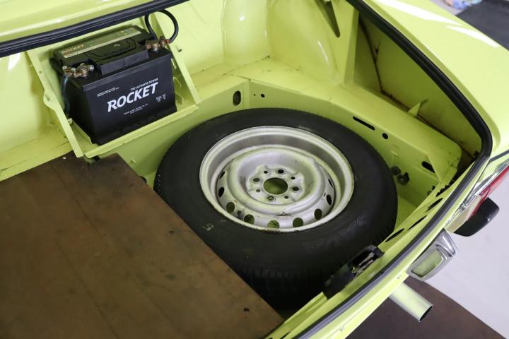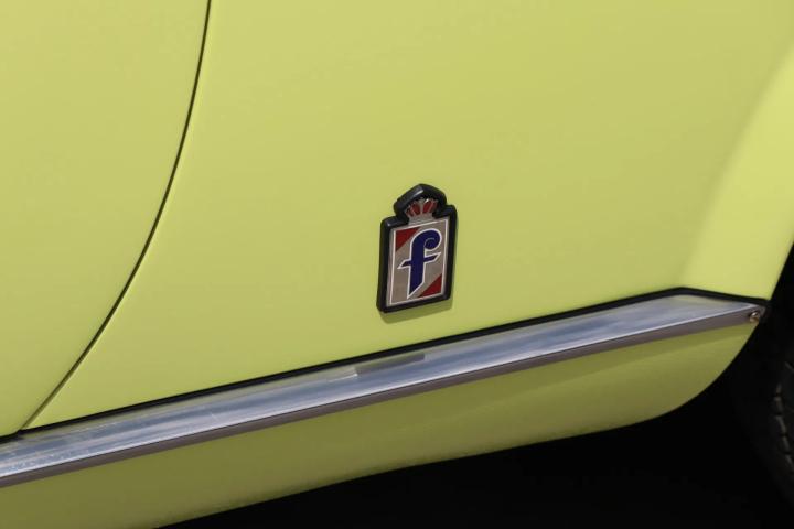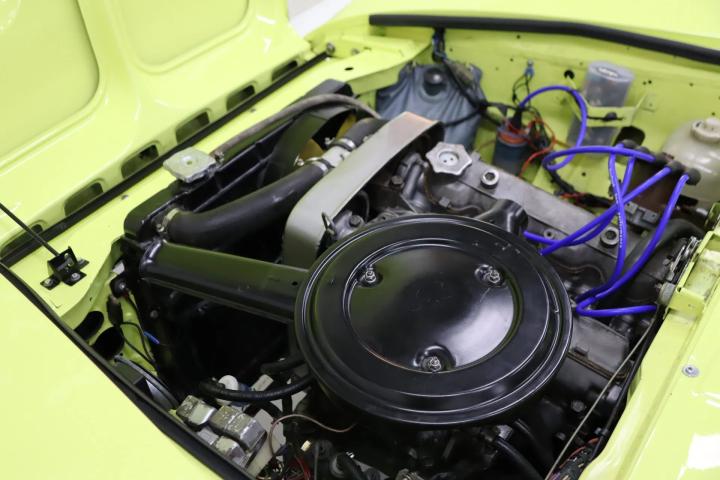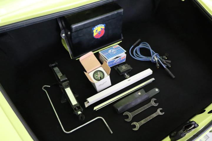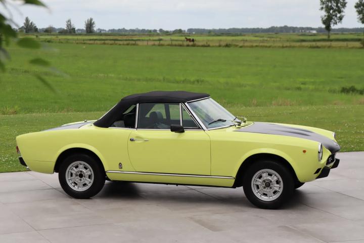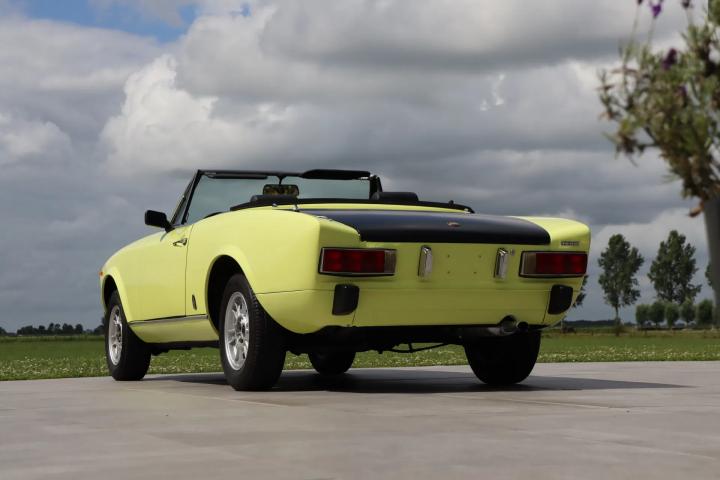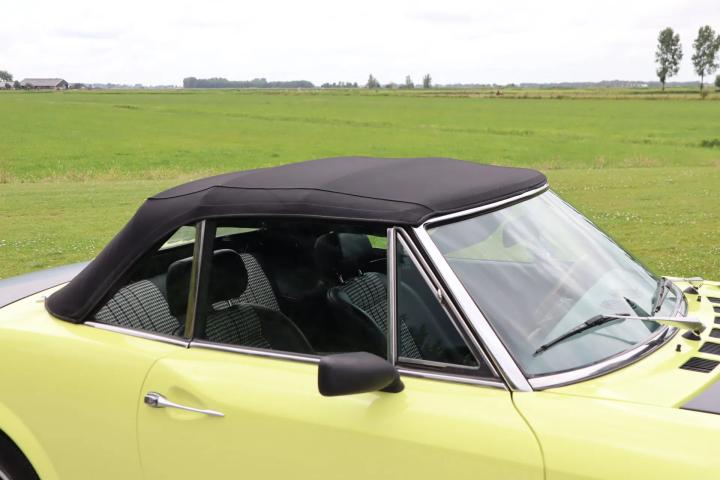 The beautiful design is still as attractive and timeless as ever. Characteristic of this type are the bumps on the bonnet. The Pininfarina emblem adorns the side. The beautiful striking yellow colour “Giallo Pagoda” (repainted paintwork) contrasts beautifully with the matt black bonnet and boot and gives the car a sporty look reminiscent of the Abarth version. The absence of the front bumper also contributes to this. The paintwork is in good condition. The car has alloy wheels. The black soft top is free of tears and also in good condition. The lines of the car are beautiful and we have not been able to find any rust on the car.