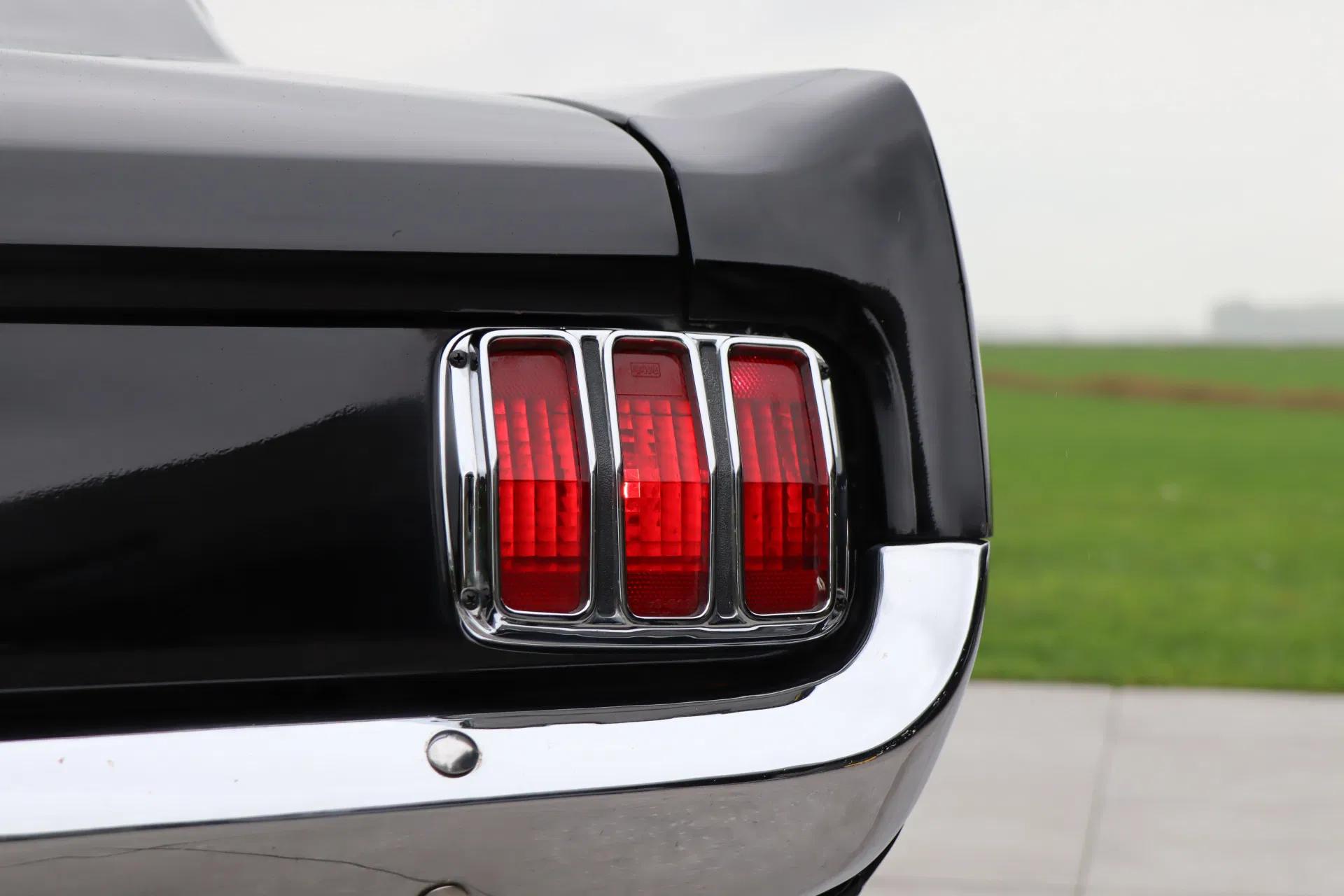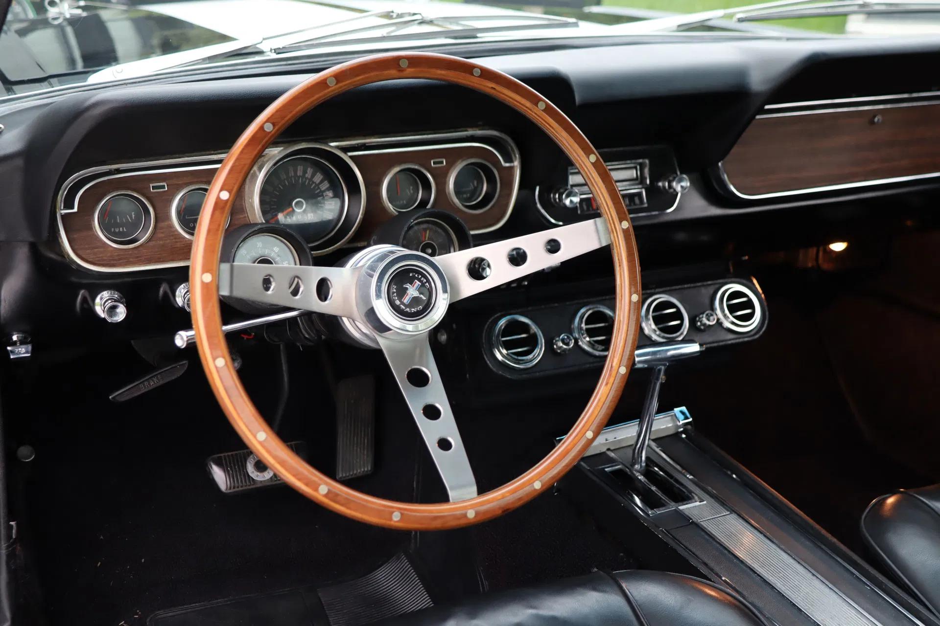 The 1966 Fastback is probably the most beautiful Mustang ever built and is praised by many enthusiasts. This example is very attractive and has a bold design: black paintwork (“Raven”) with white racing stripes. The paintwork has a deep shine and shows only minimal signs of wear. The rims make the car, so attractive 15" “American Racing” rims have been fitted. The bodywork fits beautifully and the chrome is in good condition. The windows are tinted all round. The windscreen has been replaced and fitted with a sun filter.