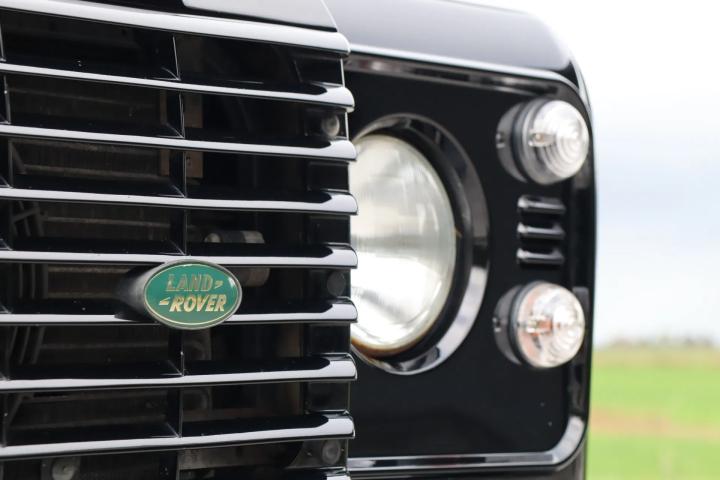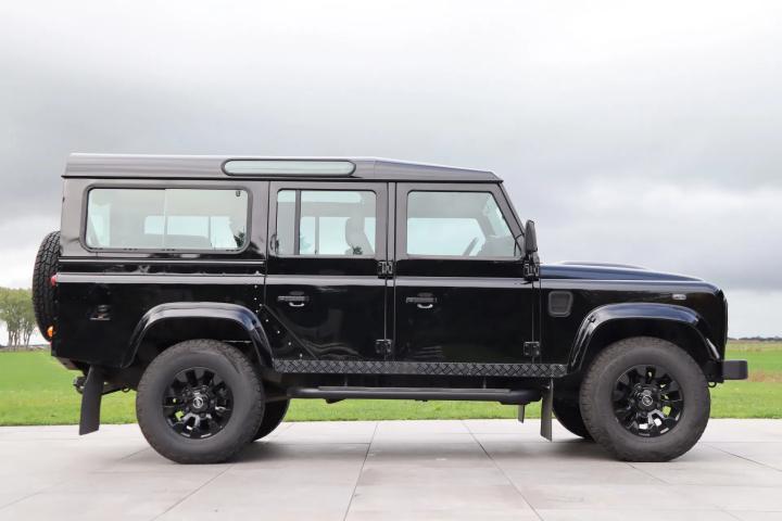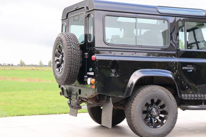 This Defender has a beautiful and rugged appearance, finished in all black. The deep black colour has a beautiful shine and the visual condition is very good with only minimal signs of wear. The 15-inch alloy wheels are in top condition. Running boards on the sides give the car an extra robust look. At the rear, there is a step for the rear passengers, a tow bar and a spare wheel. The lights and rubbers are in good condition.