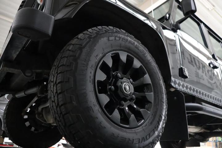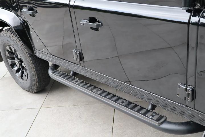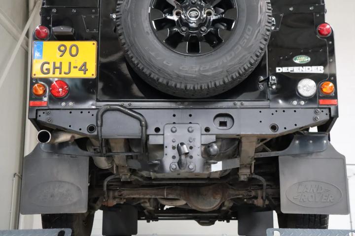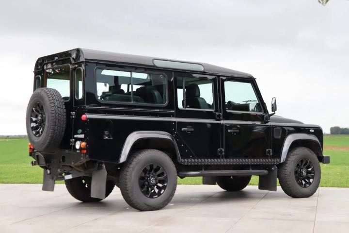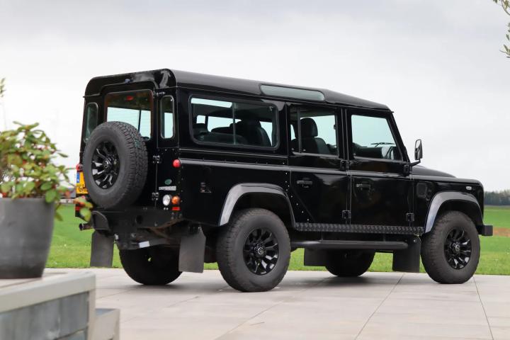 Een prachtige en stoere verschijning is deze Defender, uitgevoerd in volledig zwart. De diepzwarte kleur heeft een prachtige glans en de optische staat is zeer goed met slechts minimale gebruikerssporen. De 15-inch lichtmetalen velgen verkeren in topstaat. Treeplanken aan de zijkanten geven de auto een extra robuuste look. Aan de achterzijde bevinden zich een opstap voor de passagiers achterin, een trekhaak en een reservewiel. De verlichting en rubbers verkeren in een frisse staat.