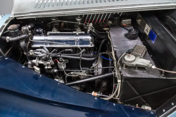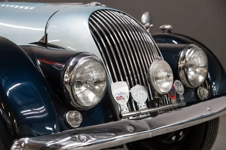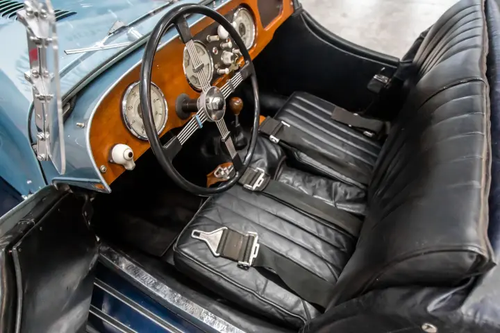 Powered by a replacement 1,991cc inline-four paired with a four-speed manual transmission, the car is finished in two-tone blue over black leather. Equipment includes a black soft top, a tonneau cover, 16″ steel wheels, hubcaps, dual spare wheels and tires, dual SU carburetors, louvered hood panels, a wood dashboard, a Bluemels Brooklands steering wheel, and seatbelts. The car comes with the Morgan Motor Company Chassis Record and a tool kit.