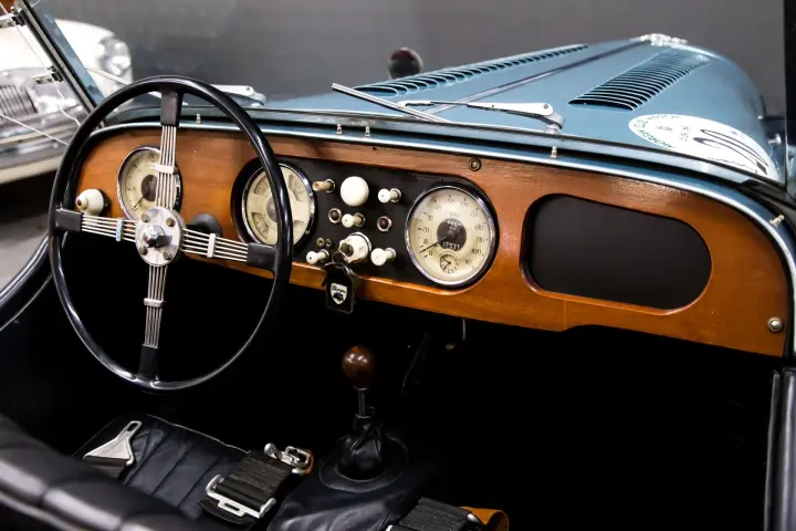 The Bluemels Brooklands steering wheel fronts Smiths instrumentation, including a 6k-rpm tachometer, a 110-mph speedometer, and a combination gauge for oil pressure, fuel level, coolant temperature, and amperage. The five-digit odometer shows 37596 miles.