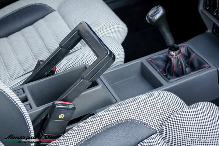 De zo goed als nieuwe stoelen zijn bekleed met geruite stof (zeer lichtgrijs en donkergrijs) met donkergrijze lederen accenten op de zijsteunen van de voorstoelen. Deze schitterende Alfa Romeo 75 Turbo werd nieuw verkocht in Italië.